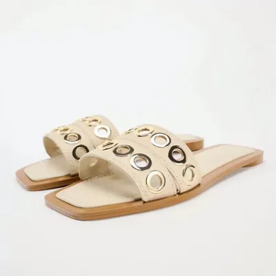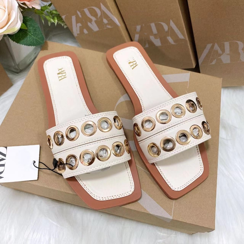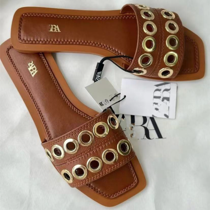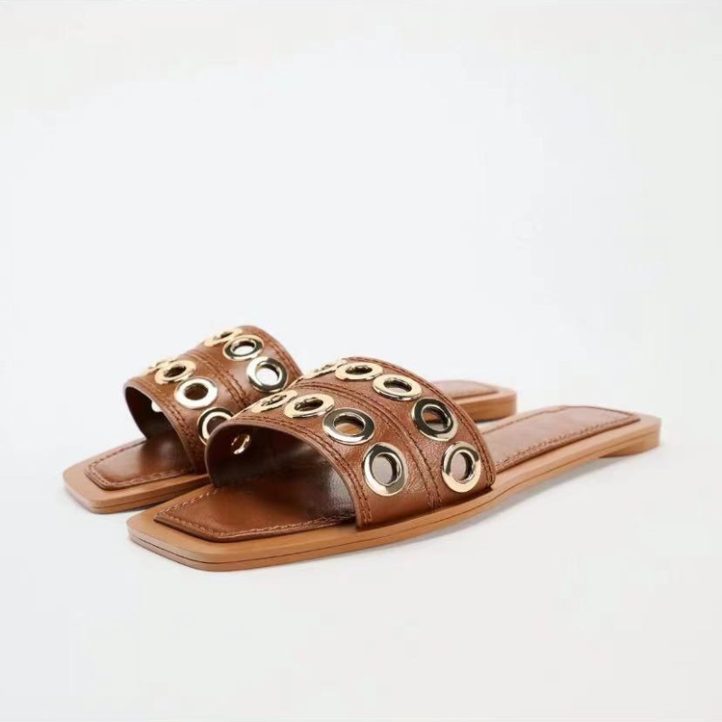 HARDWARE BUCKLE PERFORATED FLAT WOMEN'S SANDALS