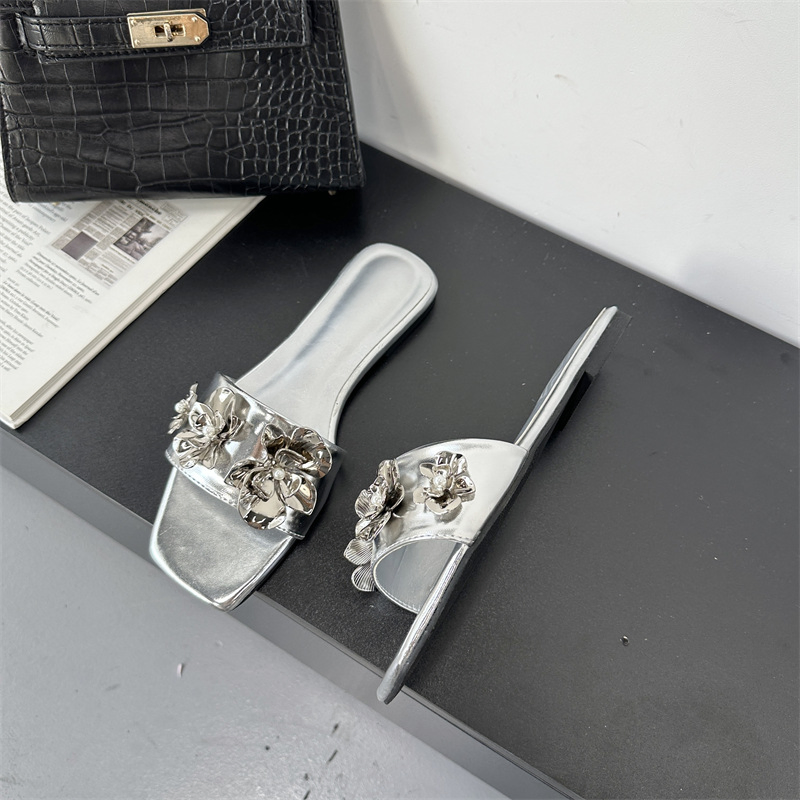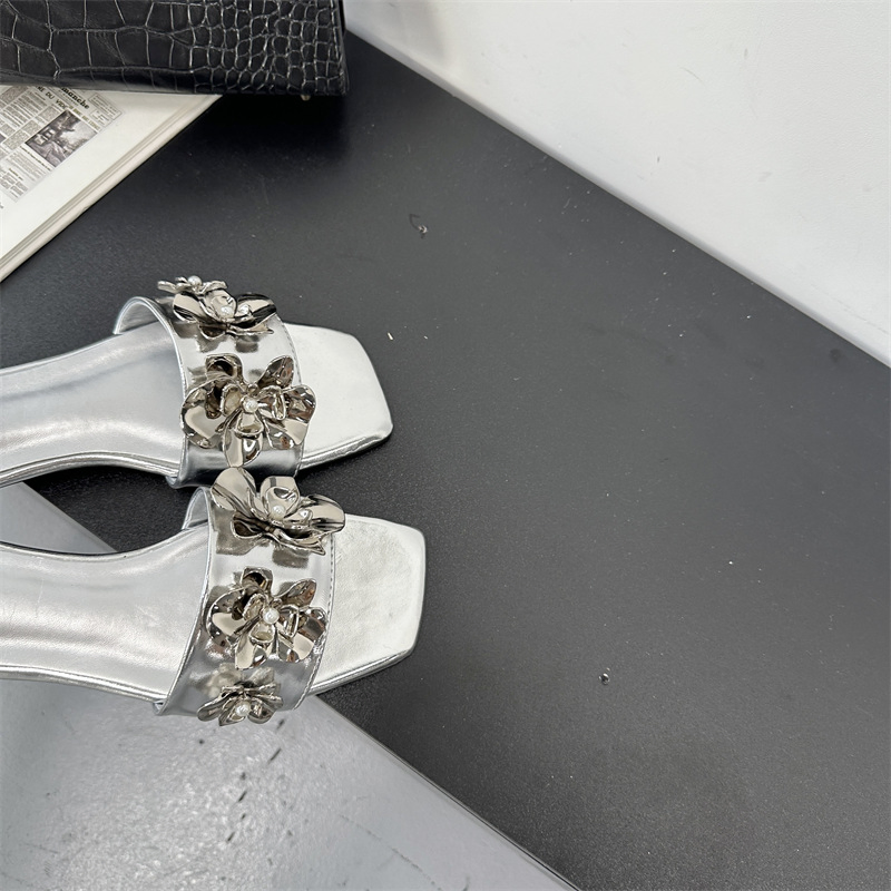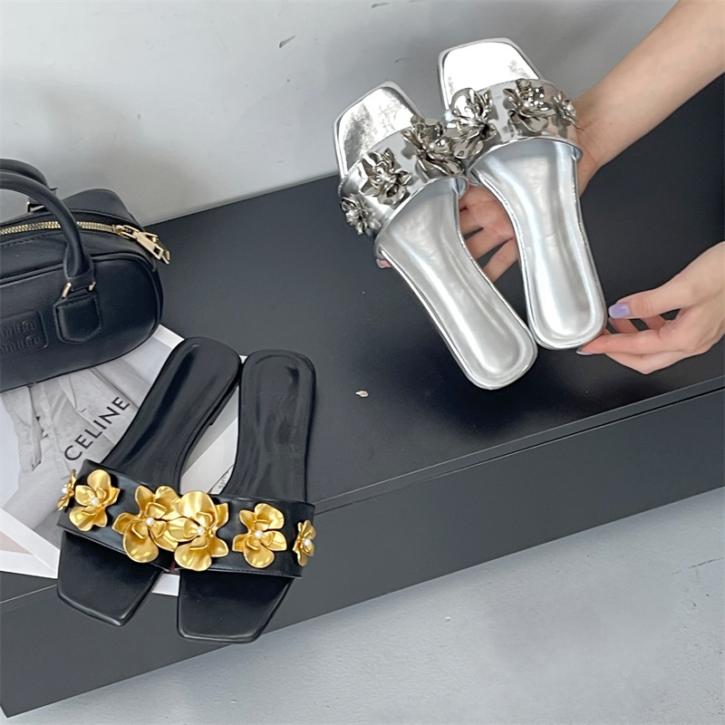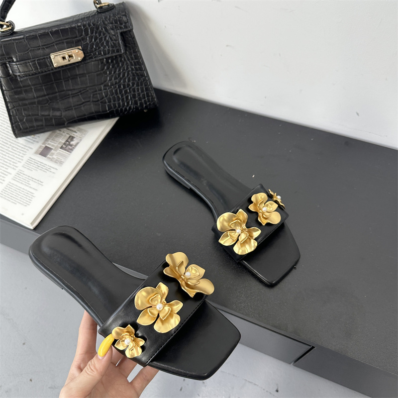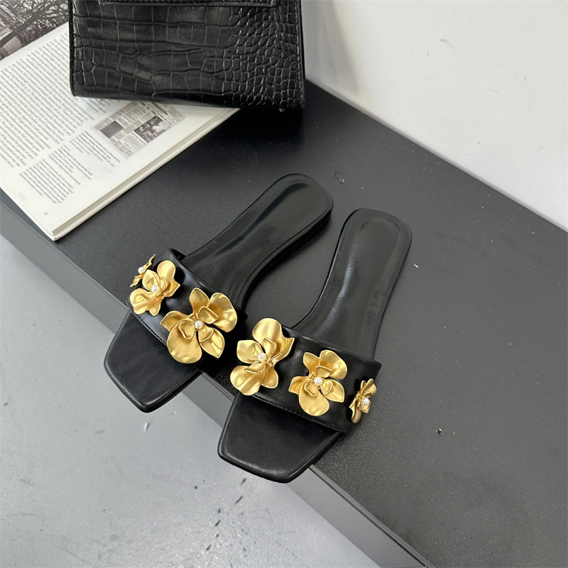 SQUARE TOE, BLACK EMBOSSED FLAT SLIPPERS